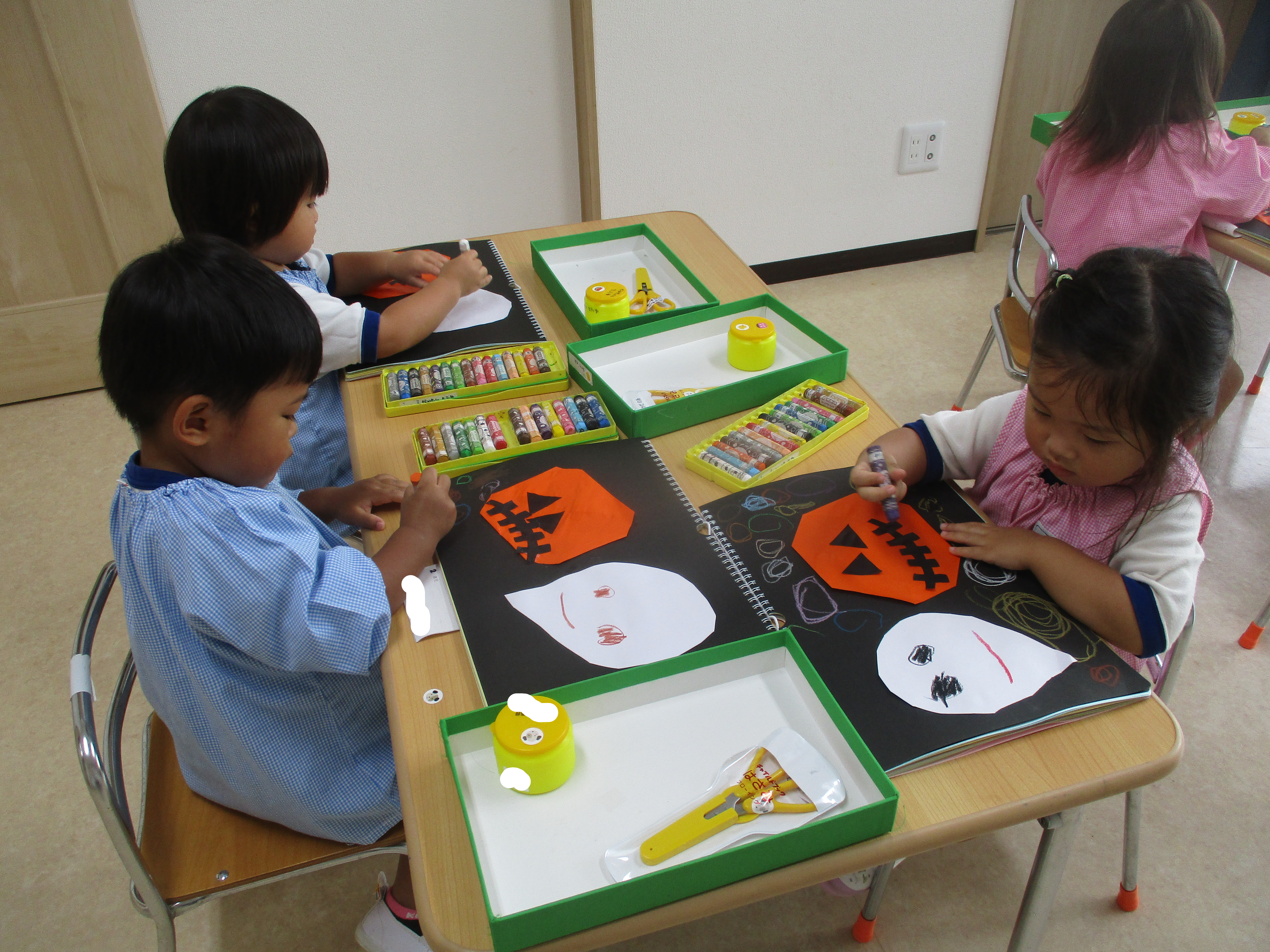 ハサミで切ったり、折り紙を折ったり、絵を描いて、素敵なハロウィン製作の完成です。