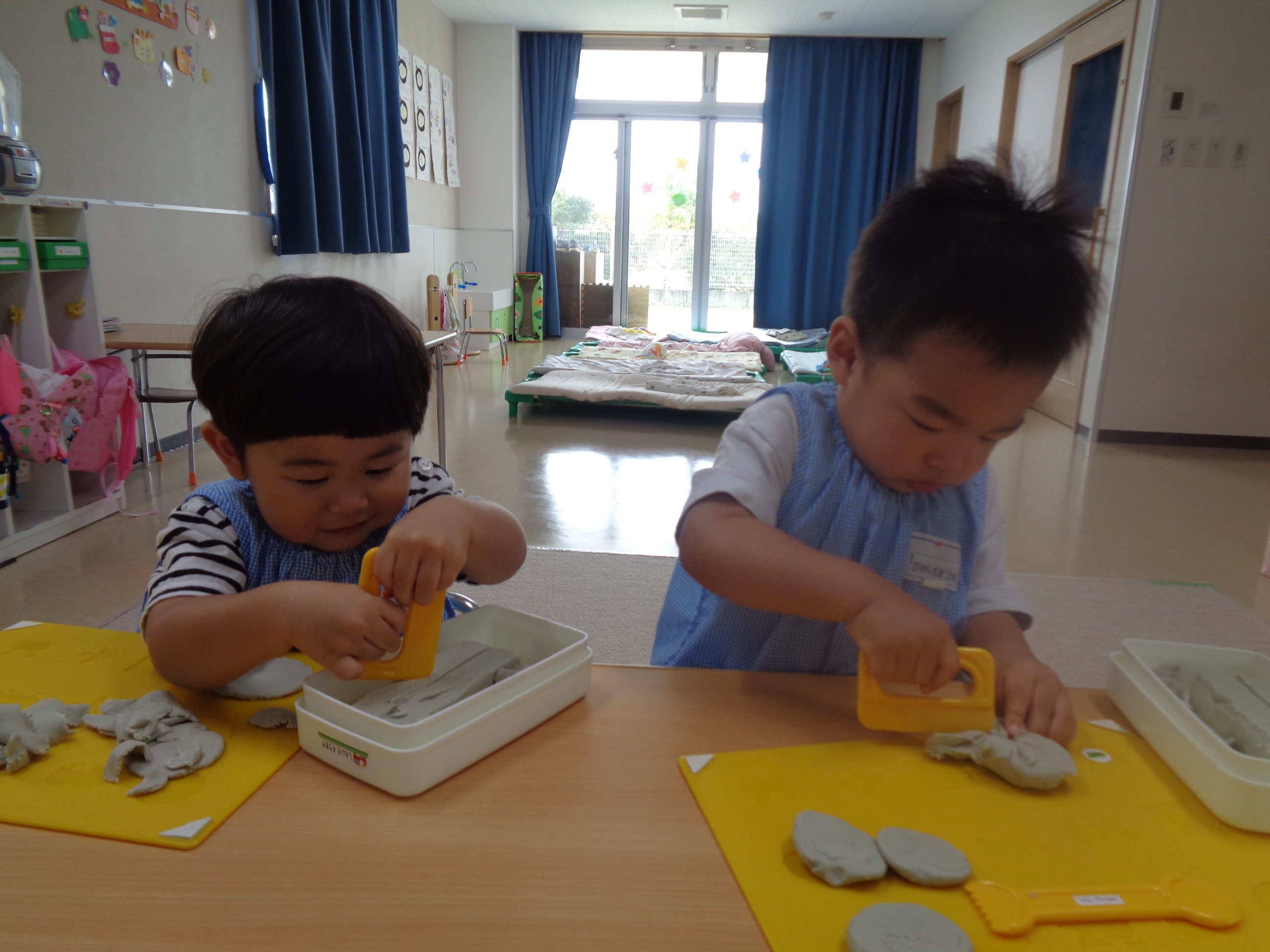 粘土遊びが大好きな1歳児さん達。ヘラを使っていろんなものを作れるようになりました。