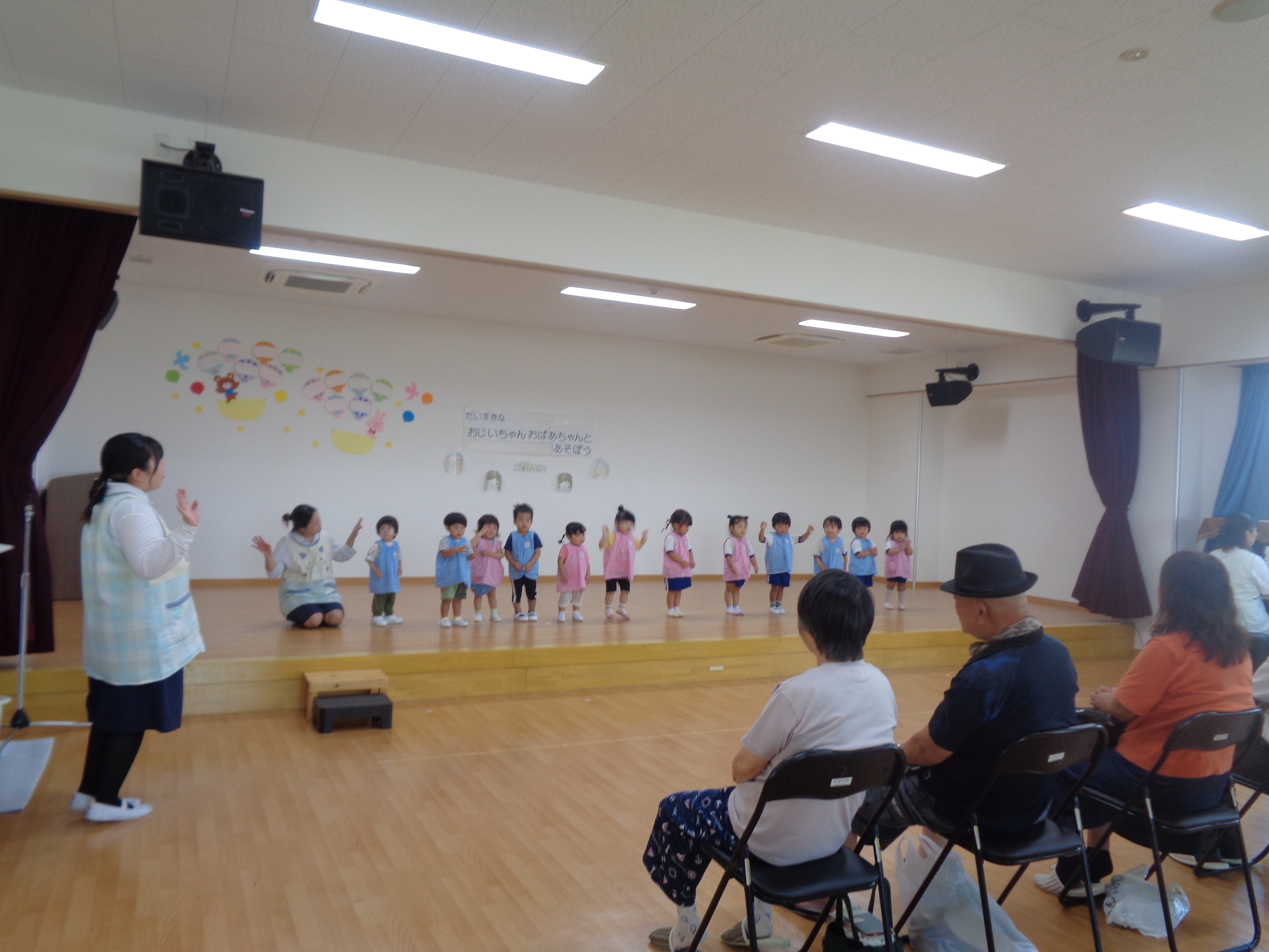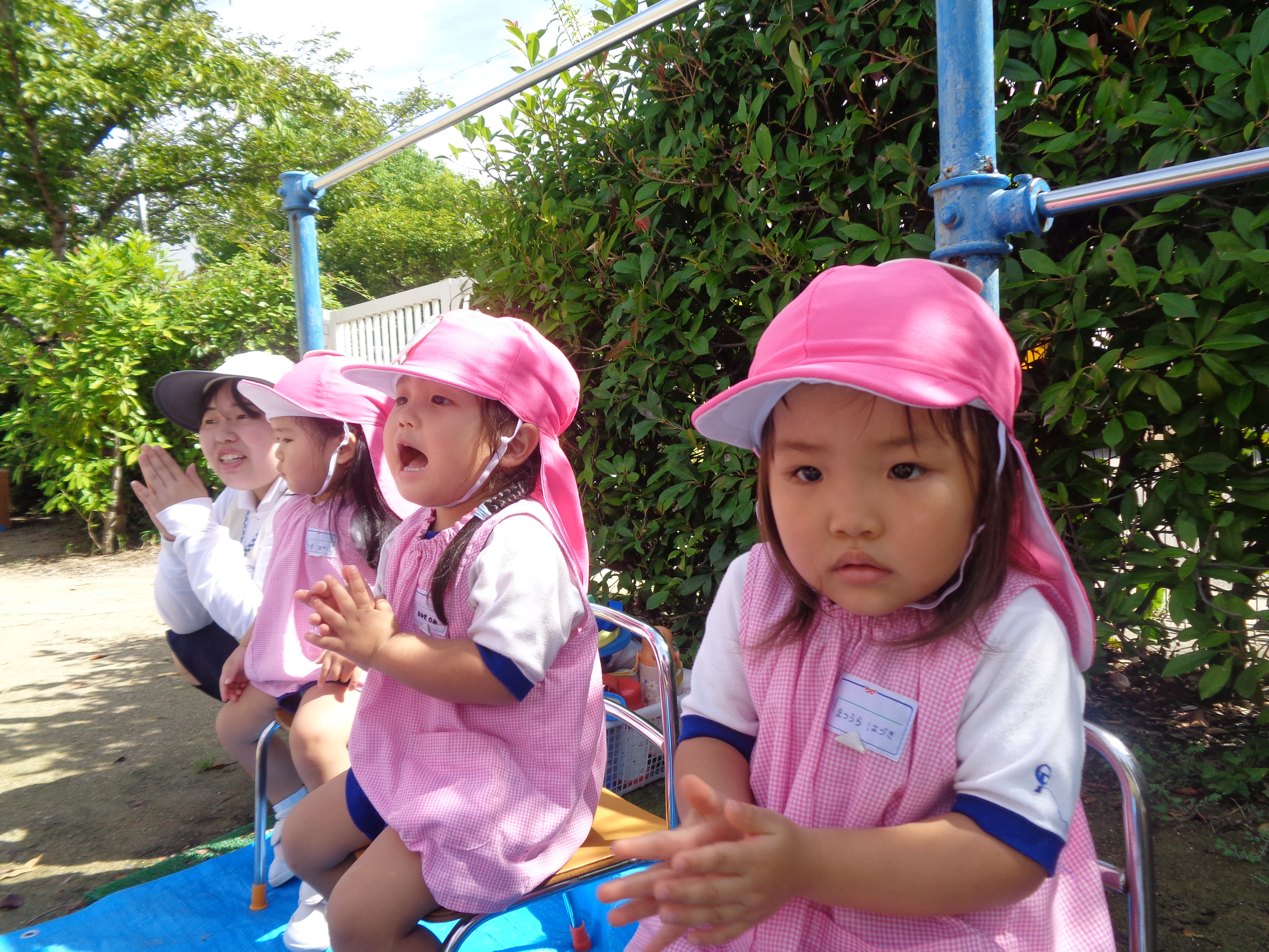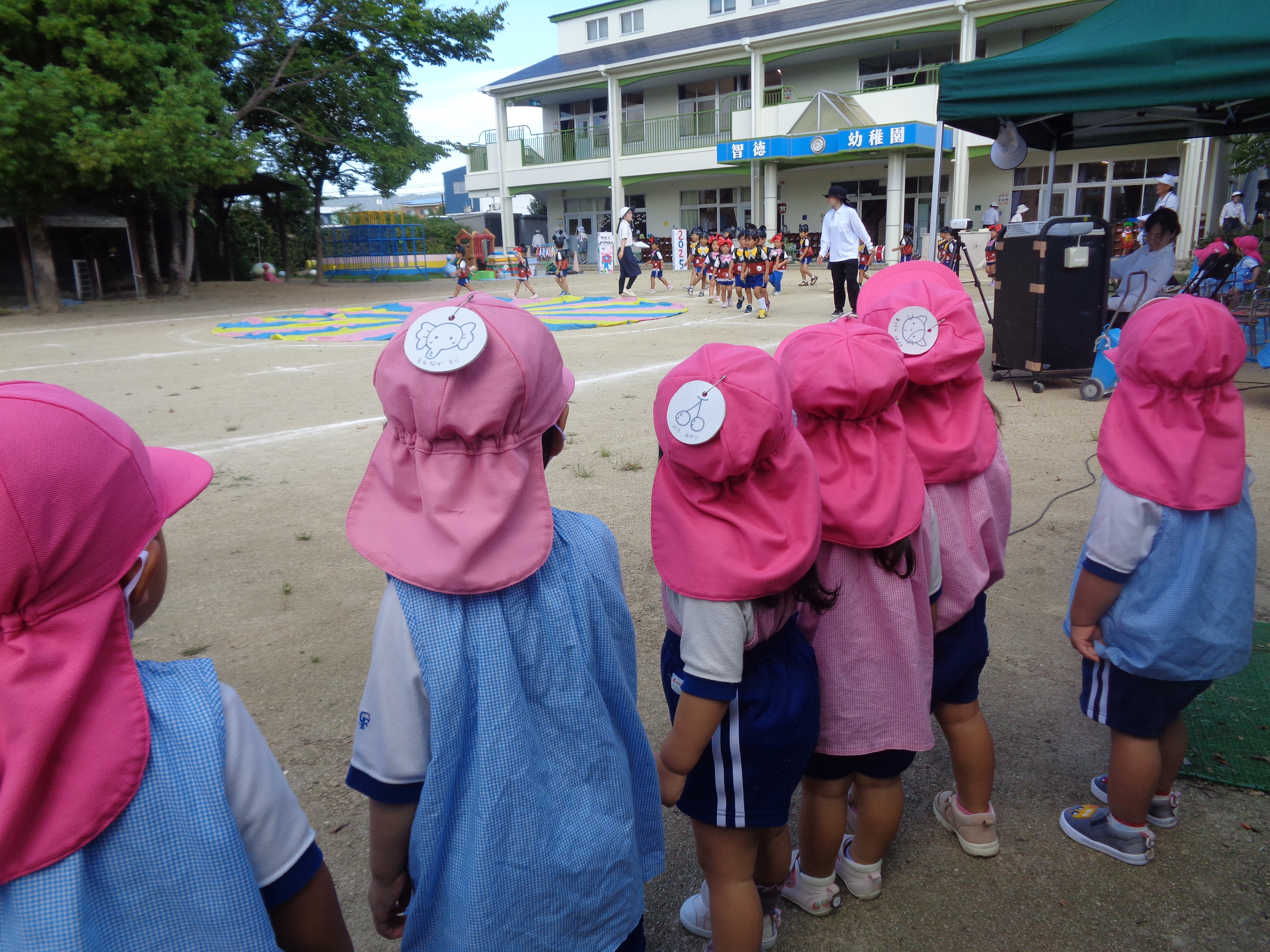 ①お兄さん、お姉さんたちの元気な掛け声とたくさんのお遊戯や競技を見学しました。「わーすごいねー。」と驚きの連続。鼓笛隊演奏にはみんな釘付けになっていました。