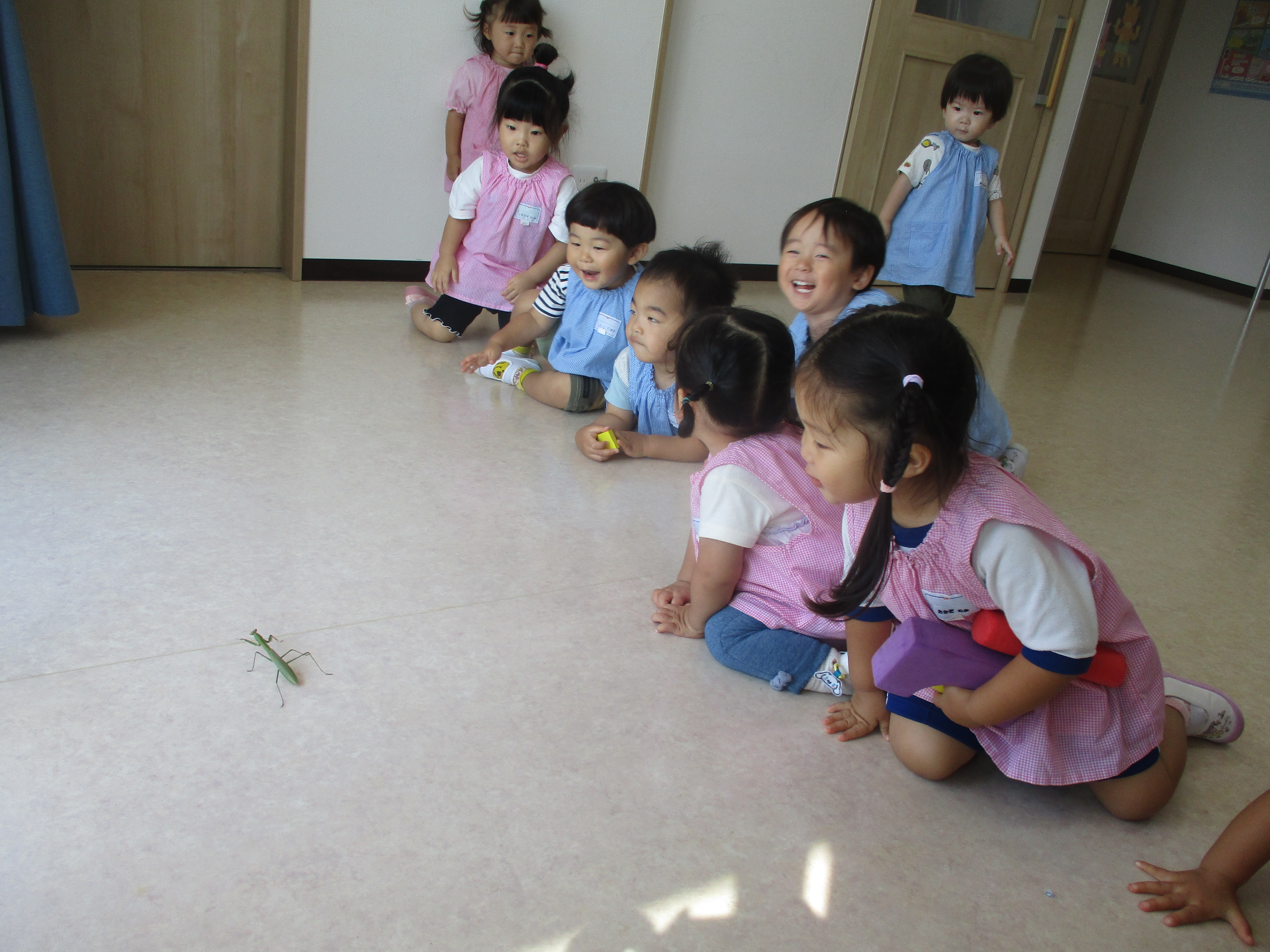 保育室にカマキリが入ってきて、みんな大はしゃぎ!!近寄りたいけど…怖い。(・_・;)