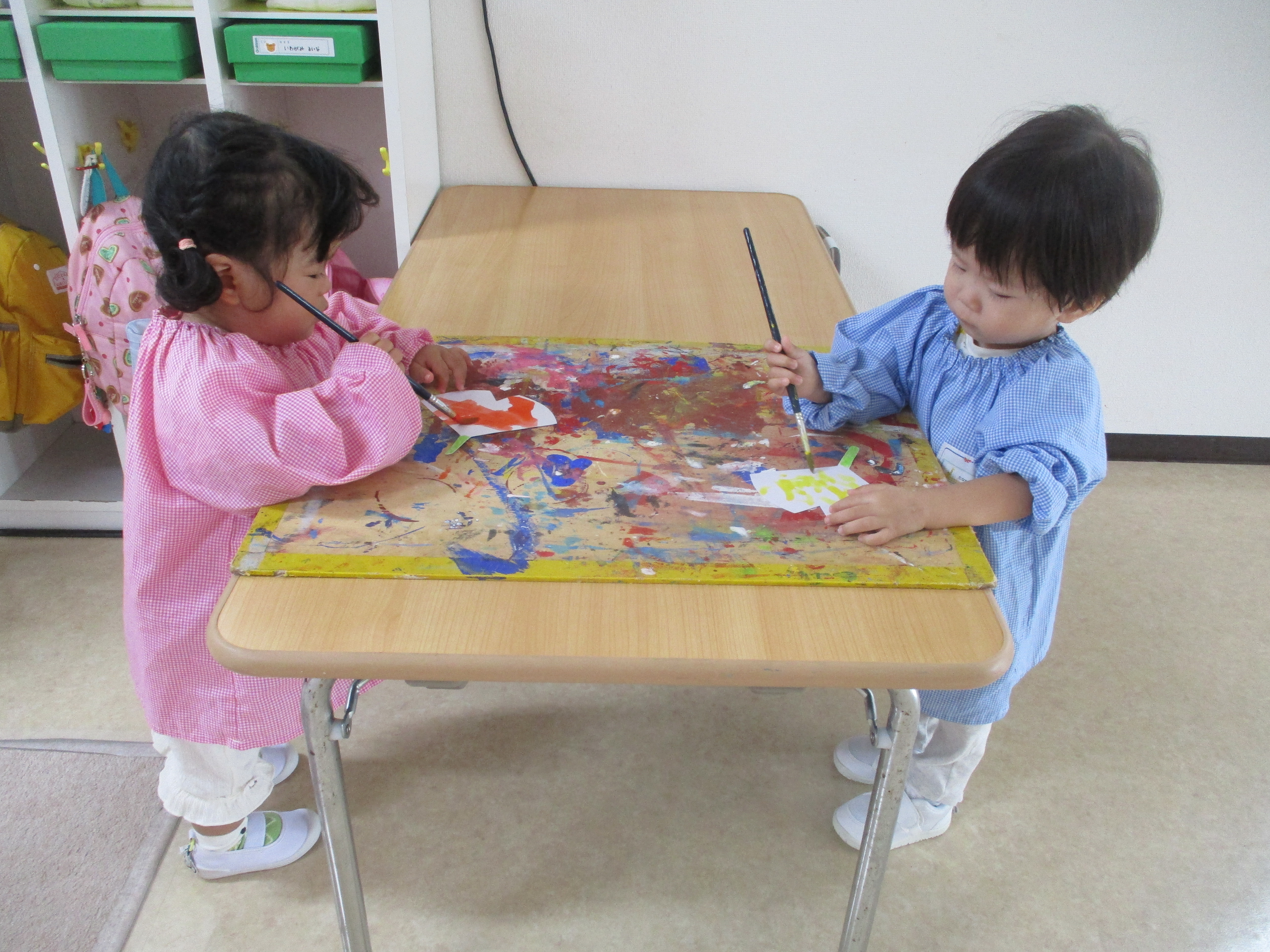 ②リズム遊びやゲーム、お絵かきなどたくさん遊んで楽しかったね。子ども達からは手作りのしおりをプレゼントしました。