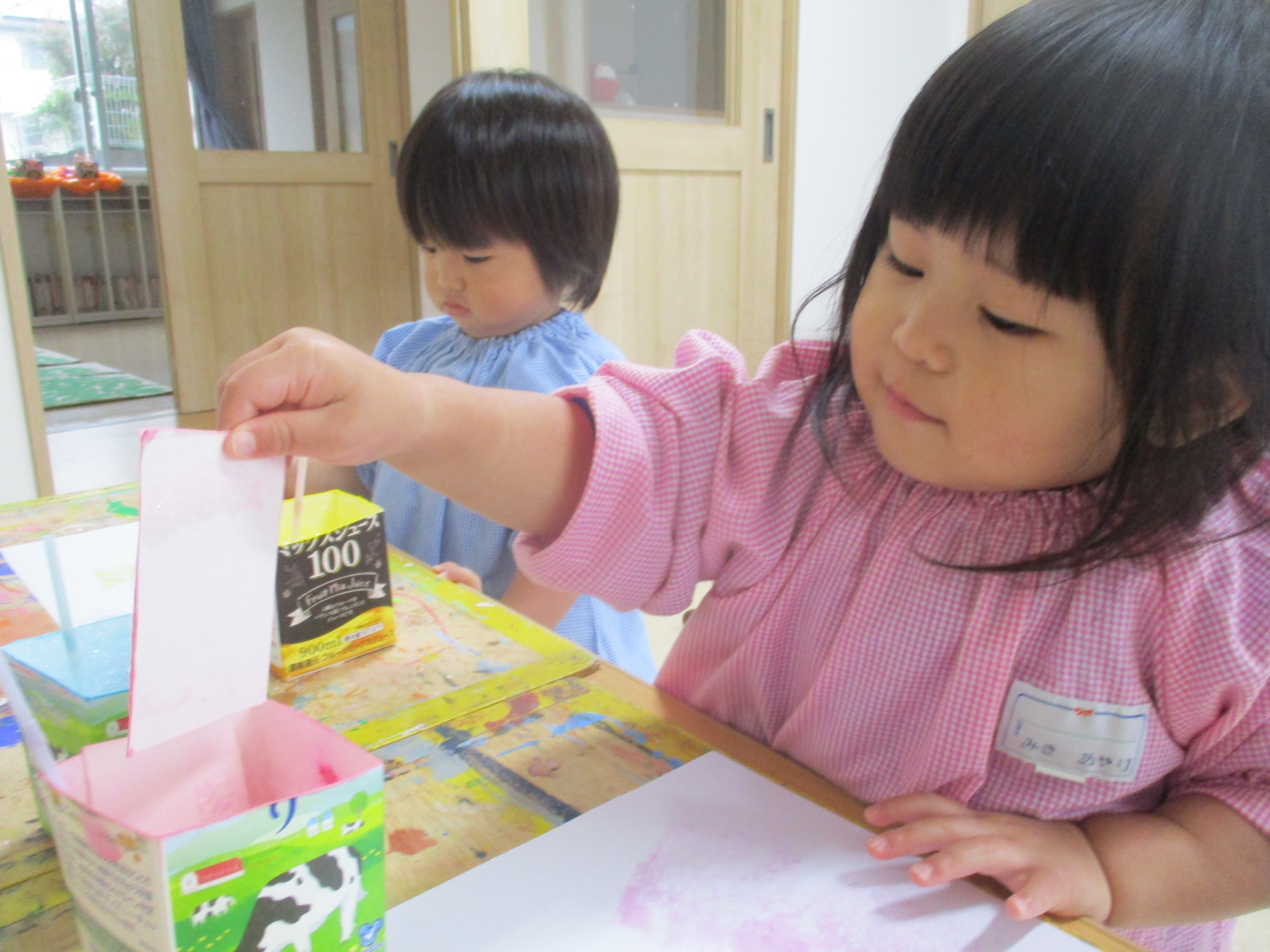 毎月絵の具を使っていろんなことにチャレンジしています。こうするとどうなるんだろう!?と考えたりワクワクしたり、楽しんで取り組んでいます。