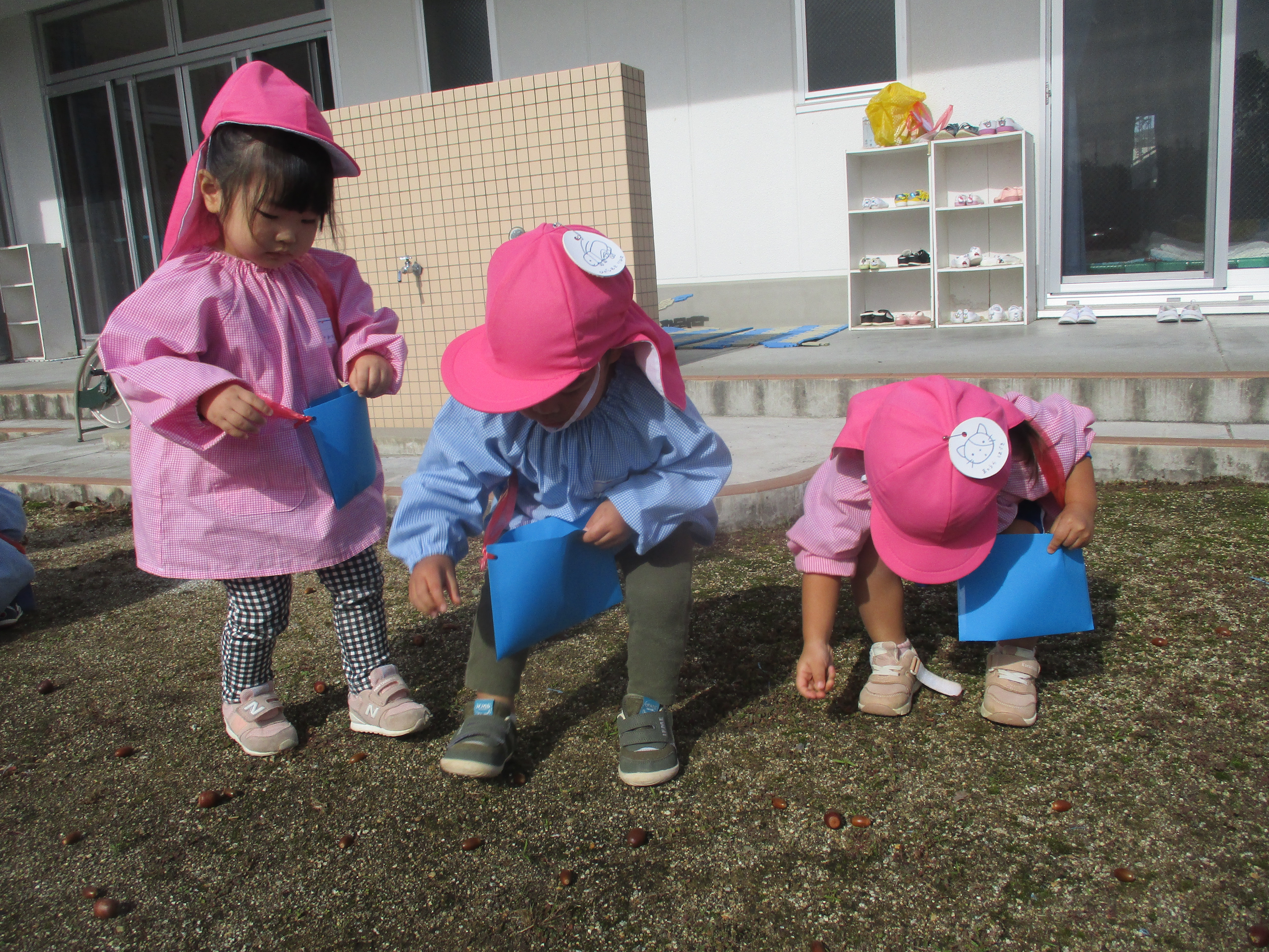 園庭に広がったどんぐりを夢中で拾う子供たち!あっという間にカバンがパンパンに(笑)