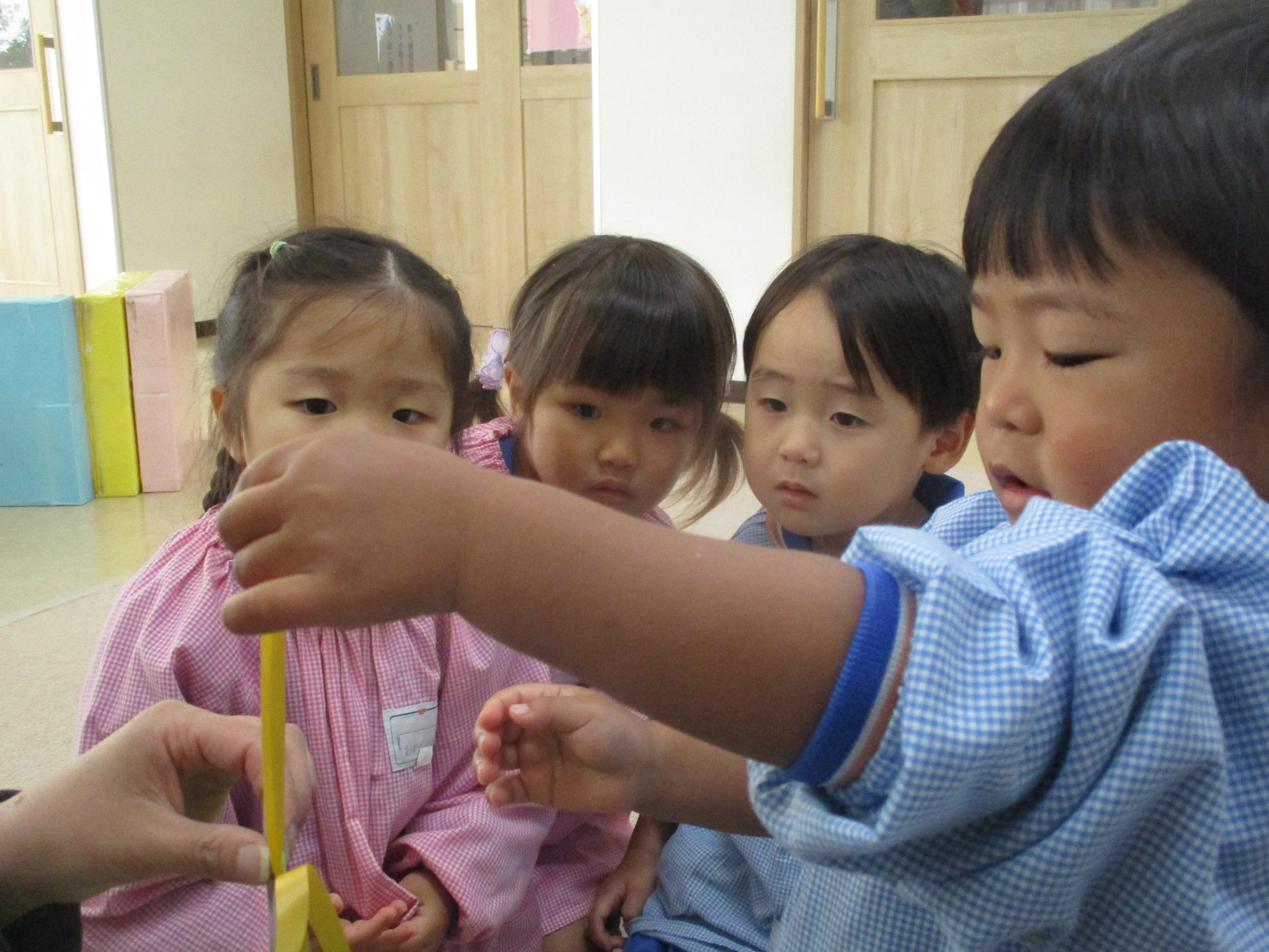 プレゼント作りで紐通しました。穴に入れて長い紐を一生懸命引っ張るみんな。順番待ちをしている子たちも興味津々で見ていました。