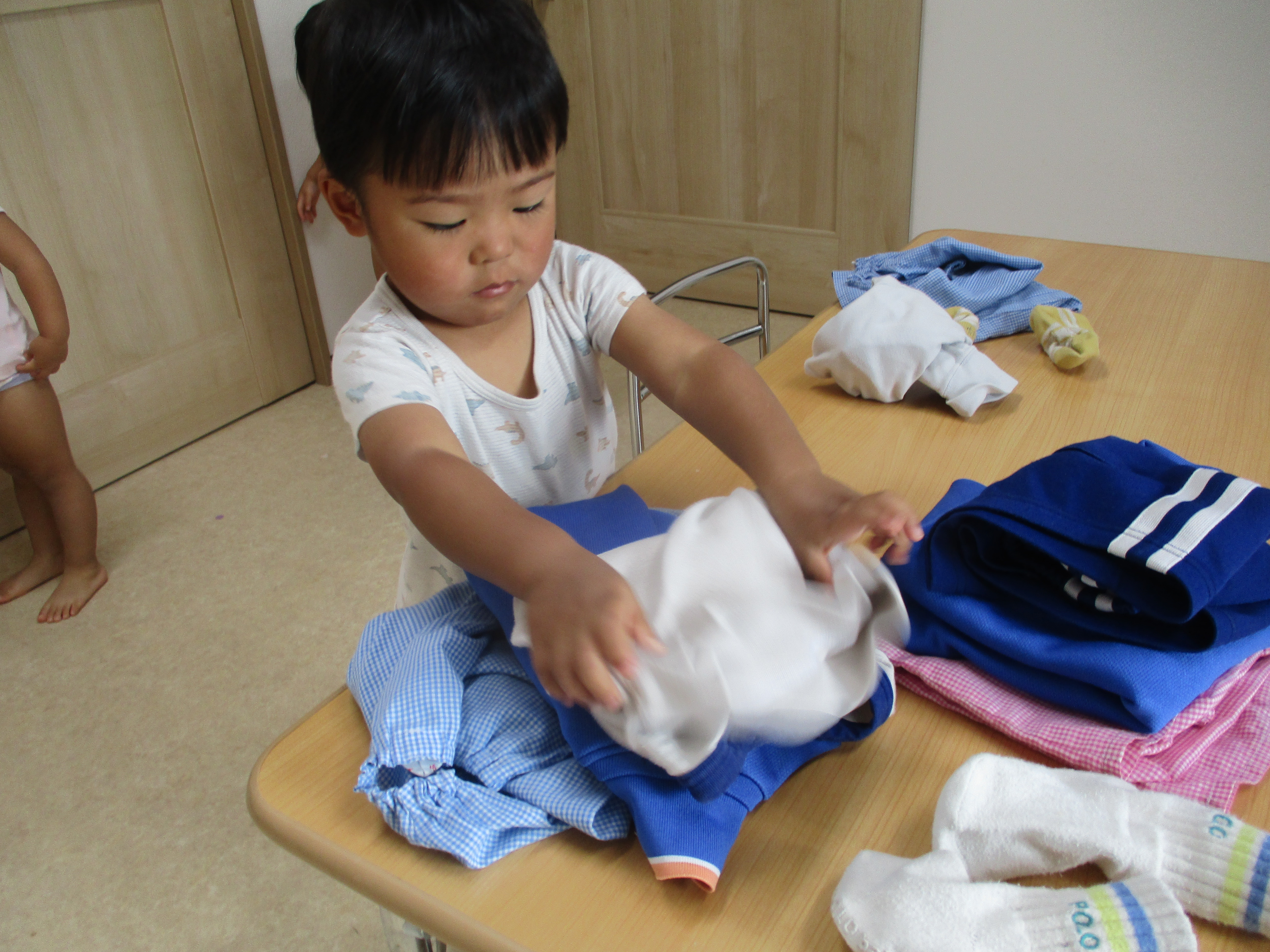 体操服を脱ぐと自分の席にきれいにたたんでおくようにしています。1歳児さもそんな2歳児さんの姿を見て学び中です。良いお手本になってくれています。
