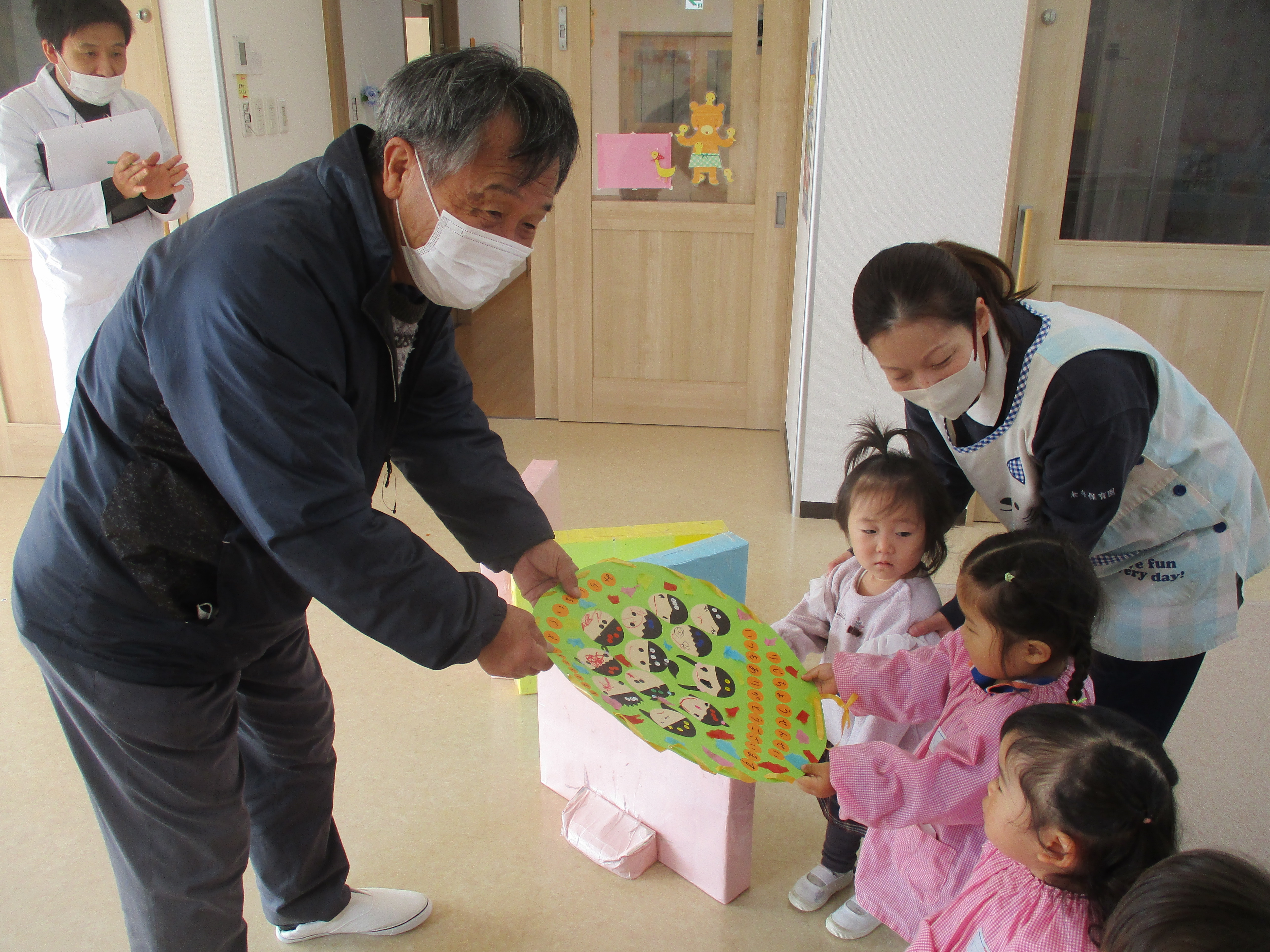 みんなが過ごしやすいように、いつも園のことを色々としてくれる。理事長先生に感謝の気持ちを込めてプレゼントをお渡ししました。喜んでくれている理事長先生を見て、子供たちもすごく楽しそうでした。