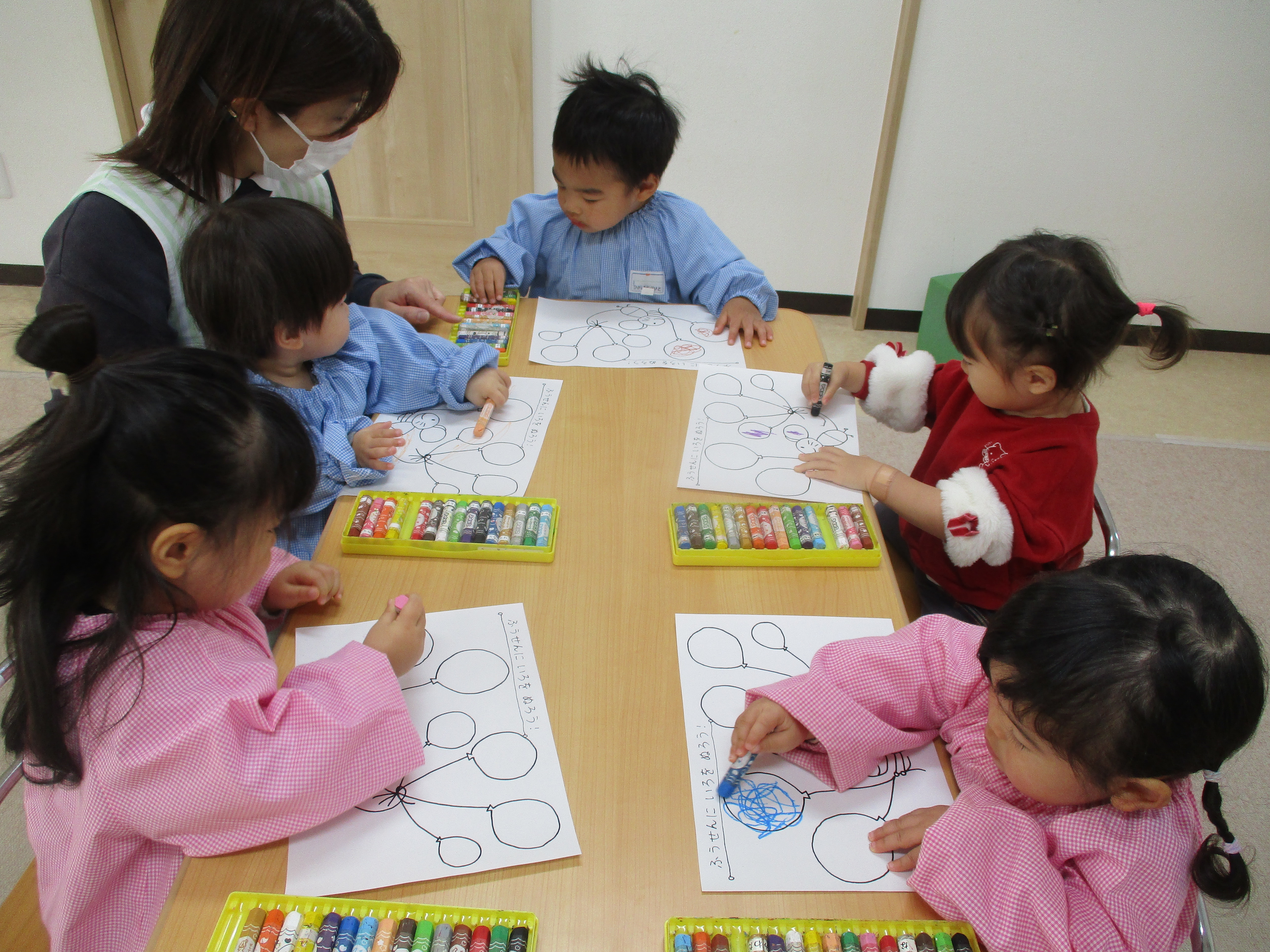 今日は風船に色を塗ります。上手に丸の中を塗っています。クレヨンの持ち方も上手になりました。