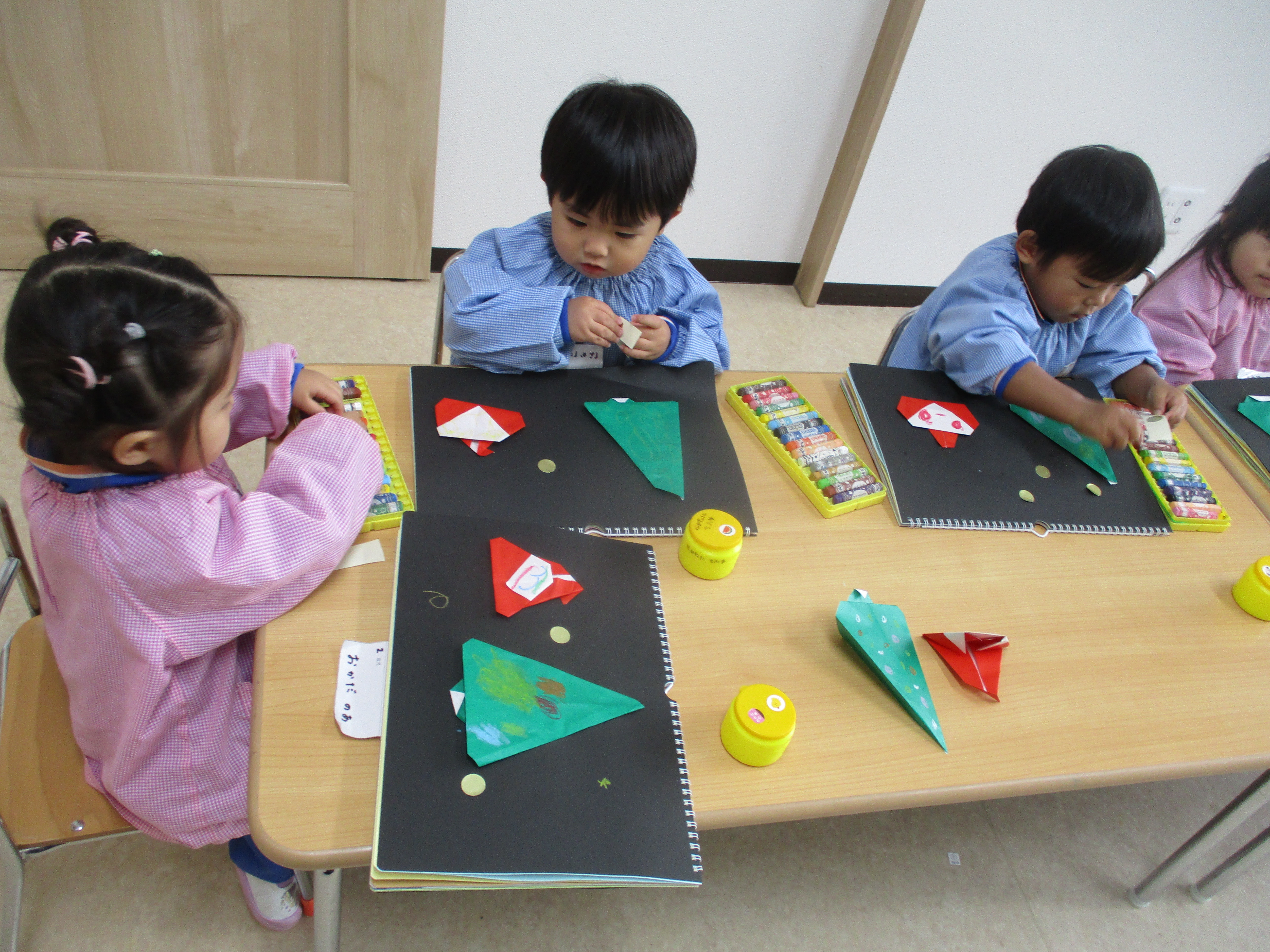 12月の製作はクリスマス。サンタさんとツリーを折り紙で折りました。指先も器用になり、細かい動作も上手になりました。手で、アイロンもしっかりかけて折り目をつけます。
