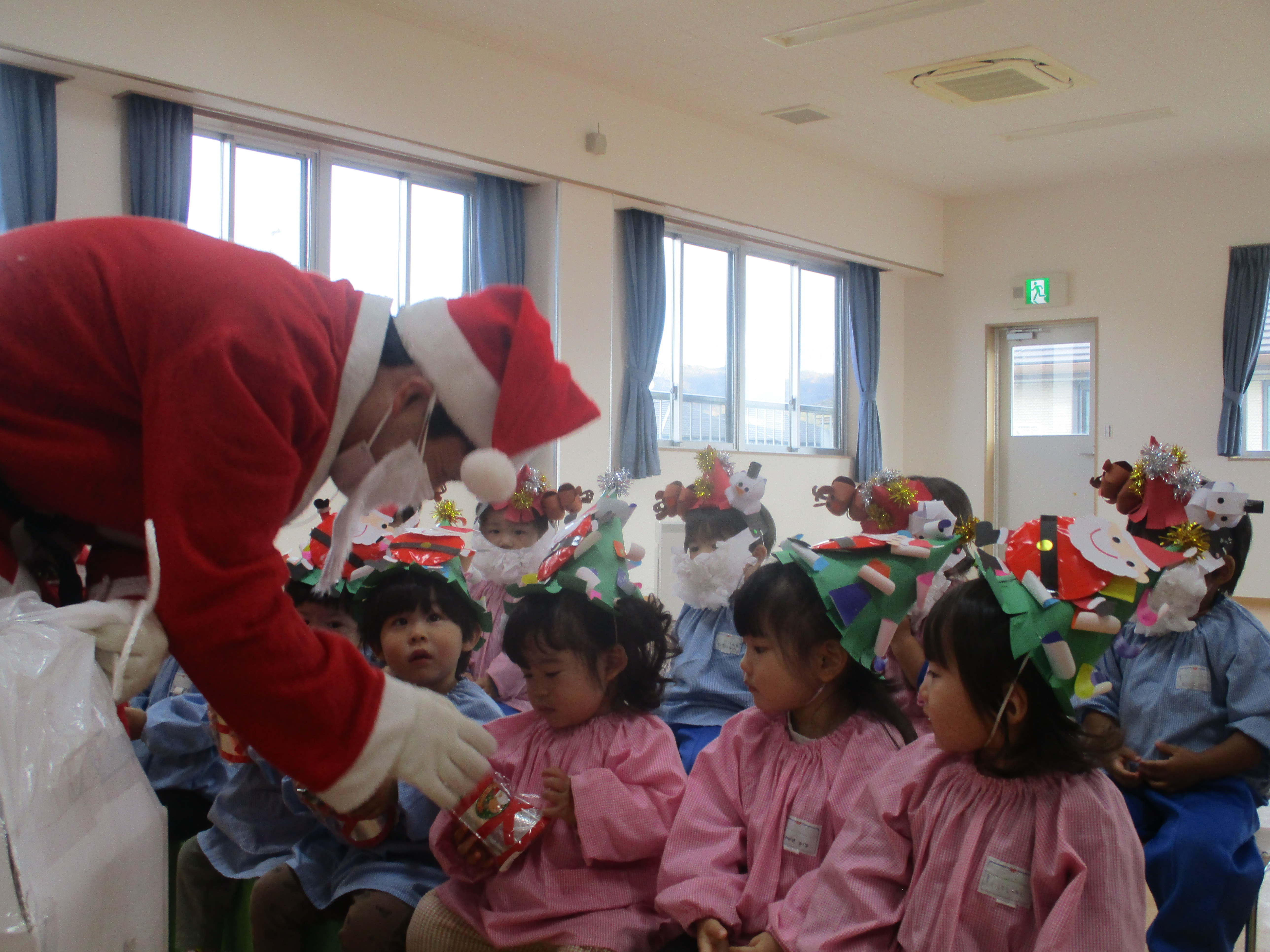いよいよサンタさんが登場!少し心配しましたが、泣く子もなく、みんな笑顔でプレゼントをもらって、楽しそう! 2歳児さんは「サンキュー!」とお礼を言っていました。