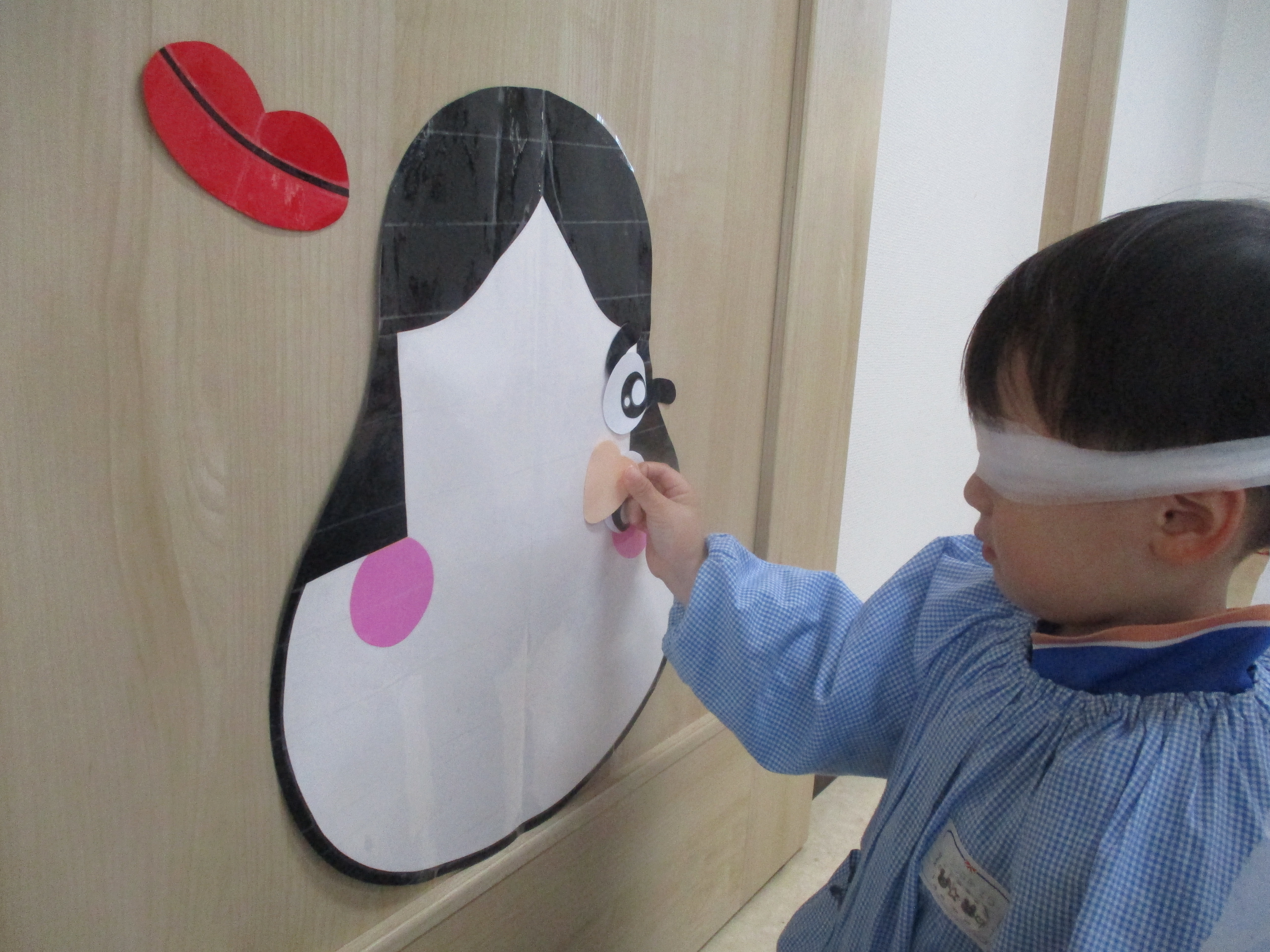 目隠しをして、顔のパーツをはっていきます。「もっと上」などと声を出してはる場所をおしえていました。