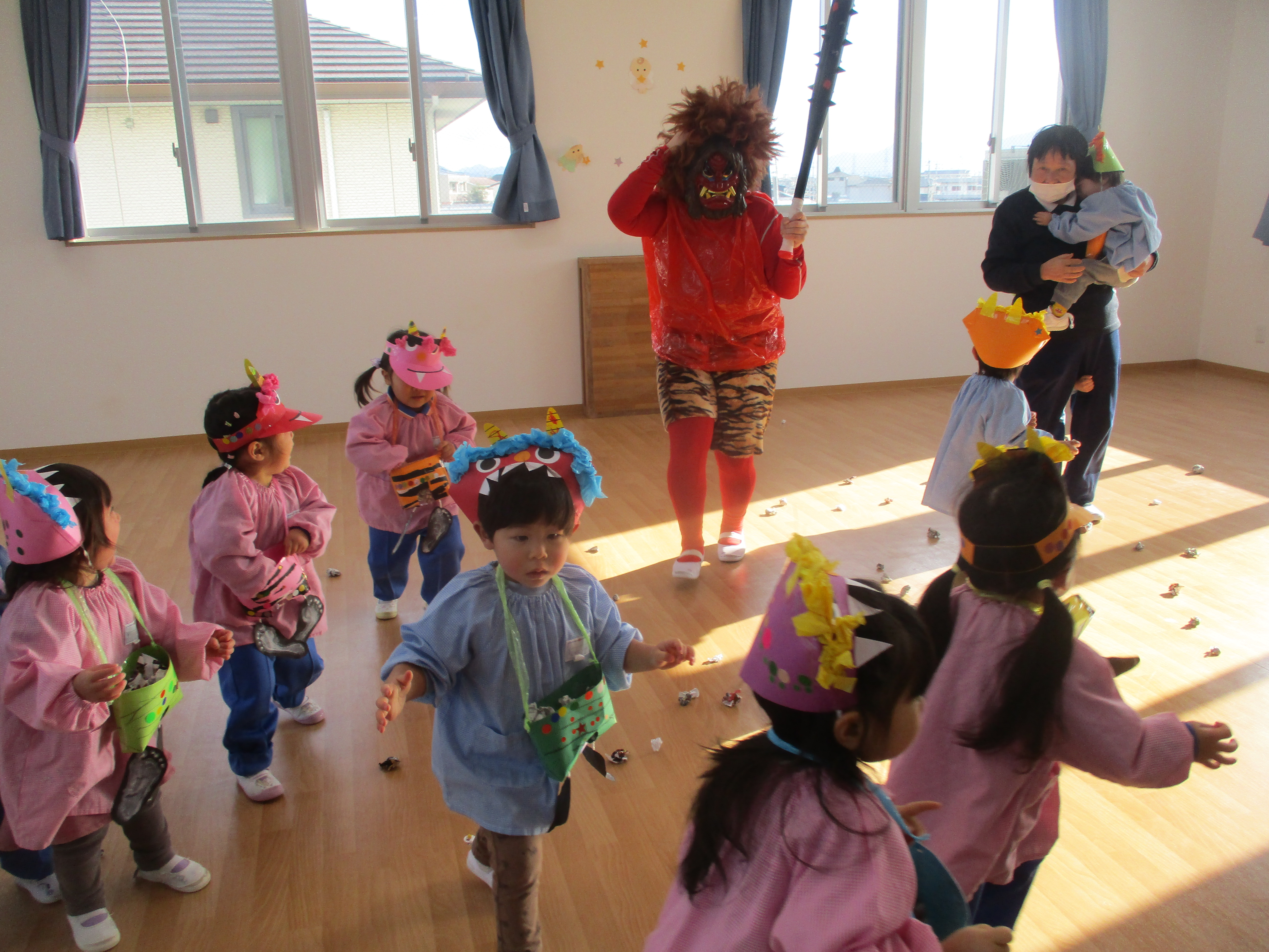 必死に逃げながらも、頑張って豆をまいてくれた子どももいて感心でした!また来年も楽しみに待っていようね!