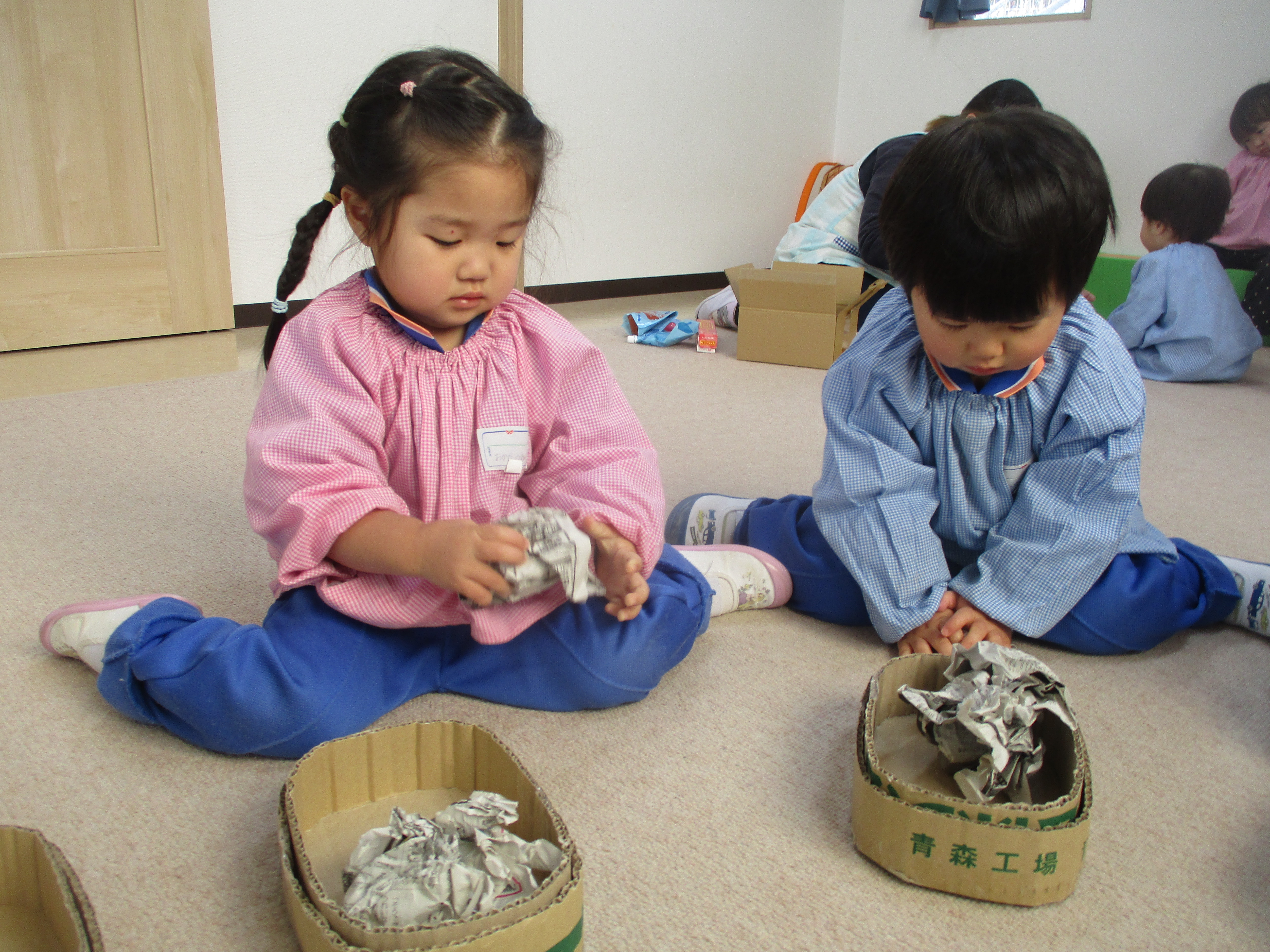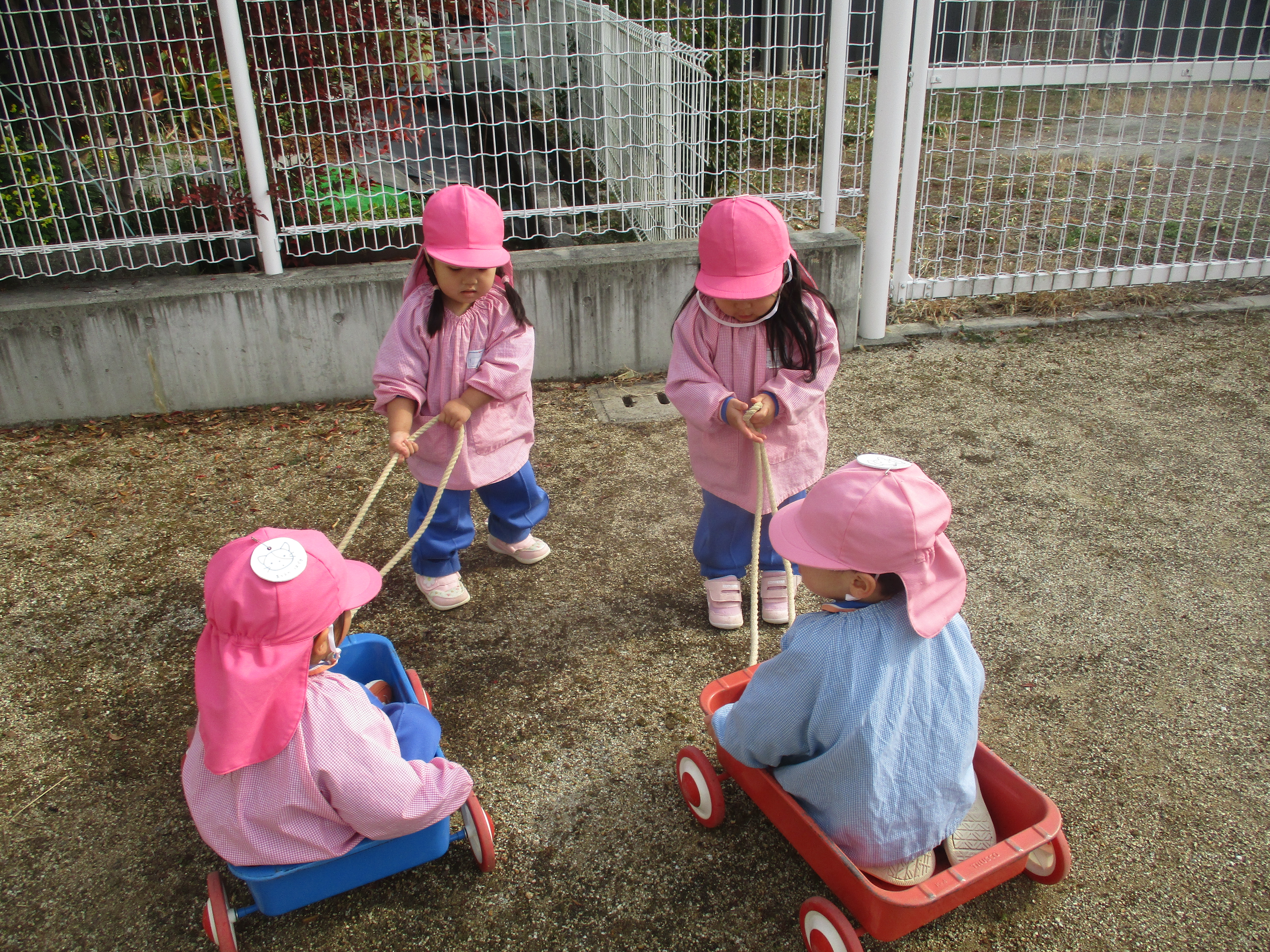 暖かい日に外遊びをたくさんします。最近はトロッコに乗る子、引っ張ってあげる子とで、交代しながら遊んでいます。とっても微笑ましいです。