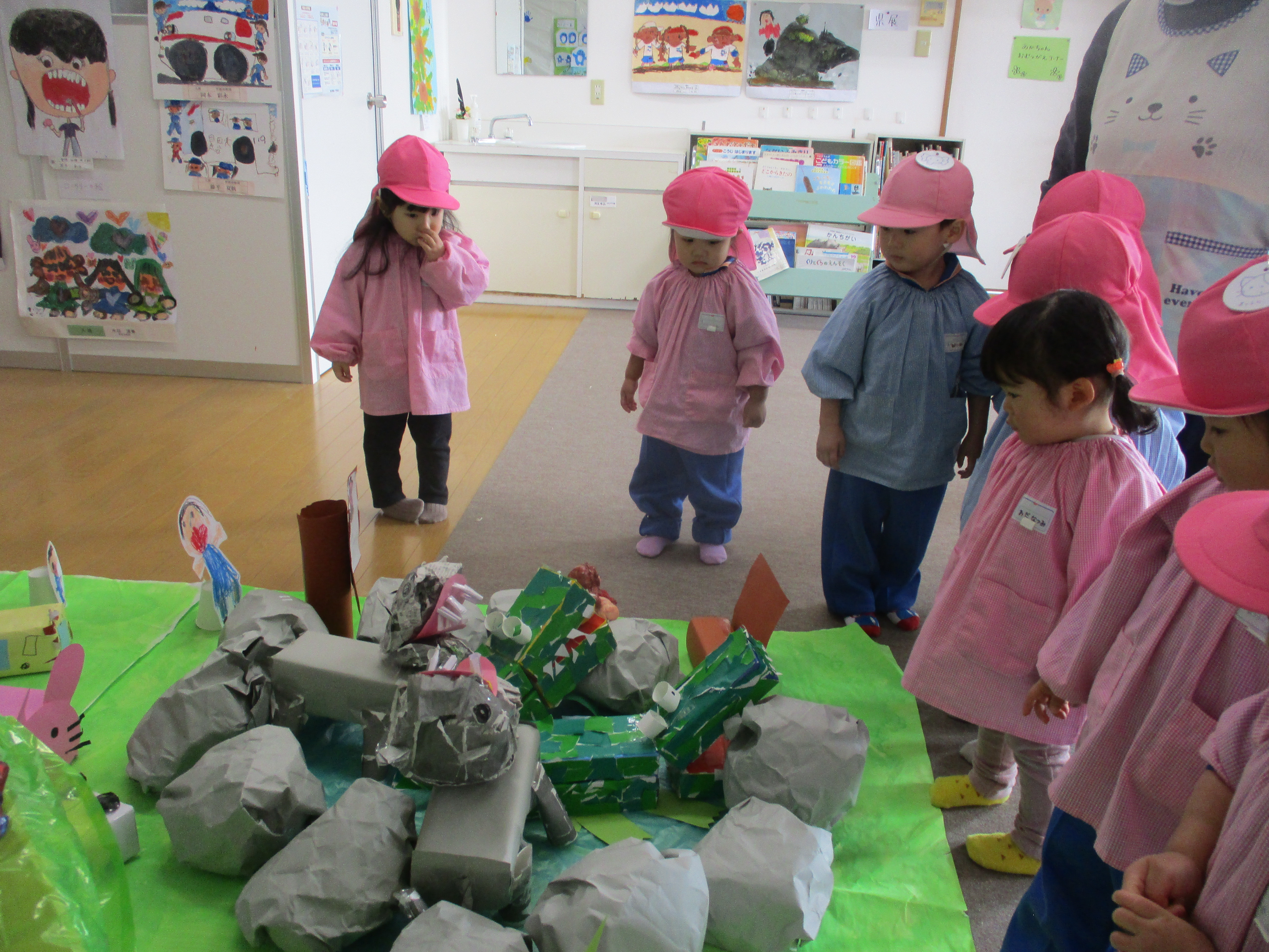 幼稚園に作品展をみせてもらいに行きました。お兄ちゃん、お姉ちゃんたちが作った素敵な作品に興味津々のみんなでした!